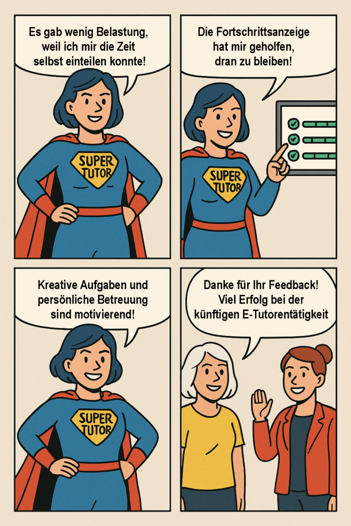 Inhaltlich vermittelte die Schulung alle Kompetenzen, die Tutorinnen und Tutoren für digitale Lehrangebote benötigen. Da ihre Tätigkeit weit über die reine Kursbetreuung hinausgeht und auch die Mitarbeit an der Entwicklung von Online-Formaten umfasst, standen vielfältige Themen im Fokus: rechtliche Grundlagen der Online-Lehre, Mediendidaktik, Lernerfolgsüberprüfung, Grundlagen des Lehrens, digitale Kommunikation sowie technische Fertigkeiten. Darüber hinaus wurden aktuelle Entwicklungen aufgegriffen, etwa der didaktisch sinnvolle und refelktierte Einsatz von KI-Tools zur Unterstützung von Lehr- und Lernprozessen (z.B. KI Comics, siehe Grafik unten).